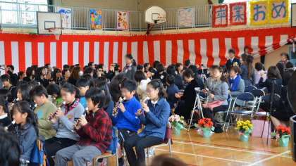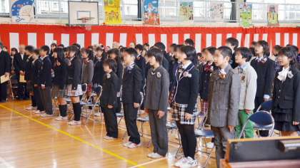 掲載が遅くなり申し訳ありません。23日、卒業式のようすを紹介します。今にも雨が降り出しそうな天気の中、多くのご来賓、保護者・ご家族においでいただき、第38回卒業式が挙行されました。4・5年生の演奏で卒業生入場。卒業生がまさに威風堂々の入場でした。続いて国家斉唱。卒業証書授与と続きます。