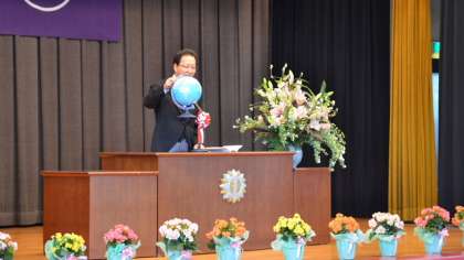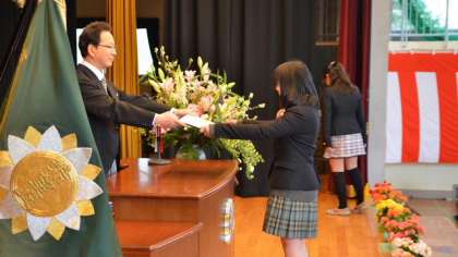 卒業生証書授与では、34人の卒業生が一人ずつ将来の抱負を語った後、フォルダーに入った自分で漉いた和紙の卒業証書を授与しました。校長式辞では、地球儀を使って空気と水の量を例えに出して、地球環境の大切さについて述べた後、困難な事態に直面しても、自分自身で考え工夫していくことが大事であることを語りました。