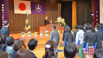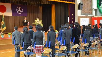 続いて、希望丘中学校副校長、本校PTA会長から祝辞をいただき、来賓の紹介、お祝いのメッセージを披露しました。この頃から小雨が降り始め、体育館の屋根の雨音が少し気になりだしましたが、卒業生も在校生も姿勢よく話を真剣に聞き、すばらしい態度でした。