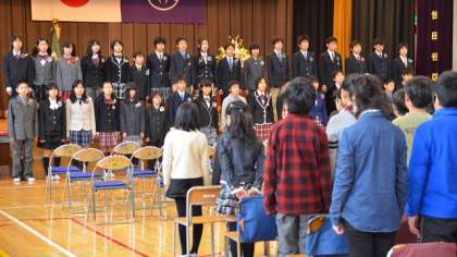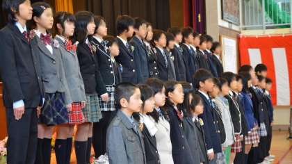 いよいよ門出の言葉(呼びかけ)です。卒業生一人ひとりが1年生からの思い出を語るところから始まりました。みんな体育館に響き渡る大きな声ですばらしい呼びかけです。在校生からは、卒業生に対する感謝の言葉を述べ、「すてきな友達」を歌いました。続いて卒業生、在校生が一緒に思いを込めて「ひろい世界へ」を合唱。子供らしいそれでいて堂々とした歌声が体育館いっぱいに広がりました。呼びかけの最後は卒業生の「旅立ちの日に」です。歌の途中で涙ぐむ子もいて、万感を込めて歌いあげました。