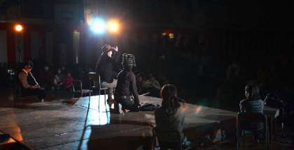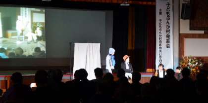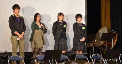 続いて「演劇くらぶ」の劇上演です。演目は「セロ弾きのゴーシュ」です。張り出し舞台で演技、それをさらに舞台後方にプロジェクターで映し出され、演出の巧みさ、そして本格的な照明・演出と相まって臨場感あふれる劇が進行しました。続いて「映像くらぶ」の作品上映です。今年度は船橋中学校と希望丘中学校の統合を控えて、両校の閉校の年であったことから、メモリアル映像を制作しました。写真は作成スタッフによる作品の紹介のようすです。