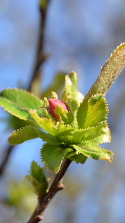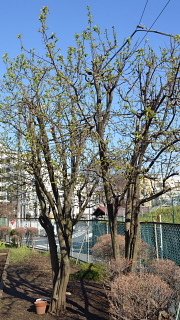 学校の春を紹介します。プール南側のカリンの木です。一斉に若葉が息吹き、よく見ると赤い花のつぼみも・・・。