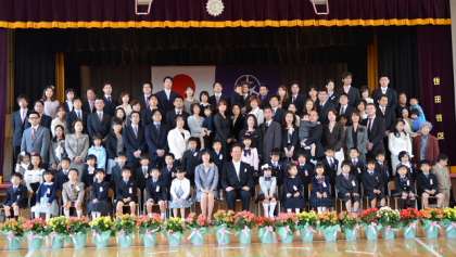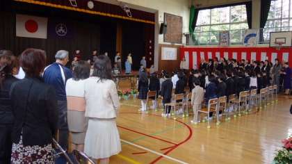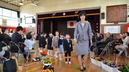 全員で校歌を斉唱し入学式は無事終了。担任を先頭に曲に合わせて退場しました。かわいらしくて一生懸命な新入生の姿に、会場の皆さんの顔にも笑みがこぼれました。