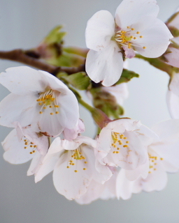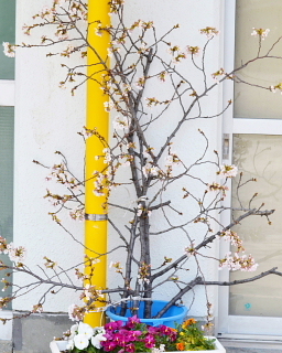 先週の突風で折れた桜の枝を、日当たりのよいところに置き、根元をバケツにつけておいたところ、見事に花をつけはじめました。せめて花を咲かせてやろうという思いが通じたような気がしてうれしいですね。