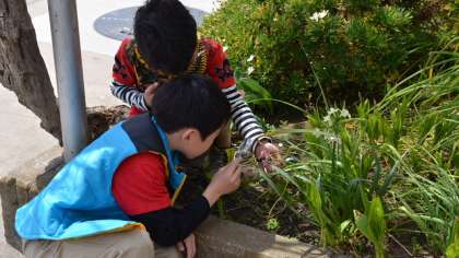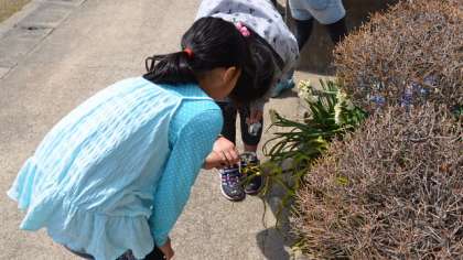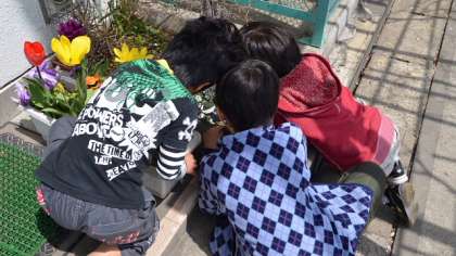 10日、春の日差しが降り注ぐ校庭で、虫眼鏡をもった3年生が、自然観察をしました。よく見ると学校の敷地のいたるところに、今まで気づかなかった小さな植物や昆虫が見つかります。虫眼鏡でのぞくと、思ってもいなかった世界が見えます。子どもたちは夢中です。発見と感動の1時間になりました。