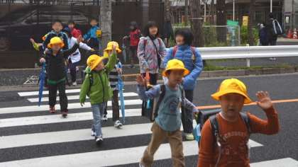 11日朝、学校前の横断歩道を渡る1年生。しっかり手をあげて渡っています。あいさつも元気にできます。