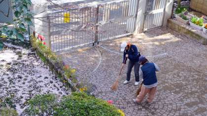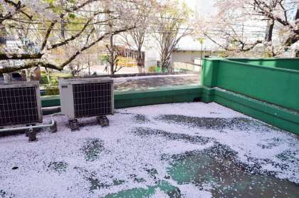 散った花びらであちらこちらがまるで雪景色。ところがこれがやっかいで、主事が一日中掃除に追われています。