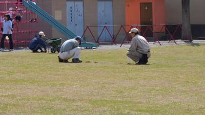 昨年秋に敷設した本校の芝生。冬をこして日に日に緑が濃くなっています。芝生が定着するまで当面の間、管理の業者が世話をしてくれることになっています。12日午後、芝生用の肥料をまいて、雑草をとってもらいました。