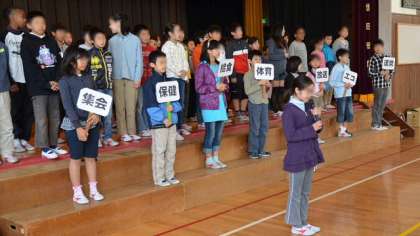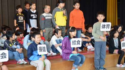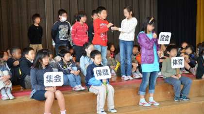 13日朝は体育館で集会を行いました。今朝は委員会の紹介です。1年生は明日の1年生を迎える会以降の参加になりますので、今日は2年生から6年生までが集まりました。舞台上に委員長を先頭に整列した5・6年生の委員会メンバー。ほどよい緊張感をもって、各委員会の紹介をしました。委員長、副委員長の紹介をした後、手短にそれぞれの委員会の仕事の紹介もしました。