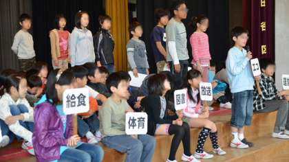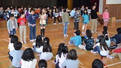 発表は原稿を見ないでするのが希望っ子のモットーです。しっかりした発表に、聞く方の2〜4年生も姿勢良く聞いていました。最後に3年生以上各クラス2名の代表委員を紹介して集会を終わりました。この短い期間で準備したにもかかわらず、司会も発表も聞く方もりっぱな集会でした。