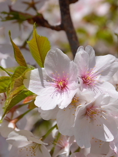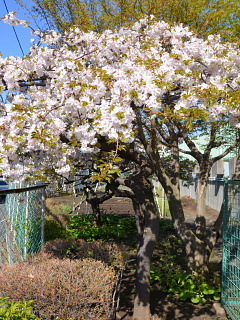 プール南側、学校園のところに咲いているシダレザクラの一種です。あまり枝垂れていませんが、シダレザクラです。これもソメイヨシノより花の中心部の色が濃いですね。