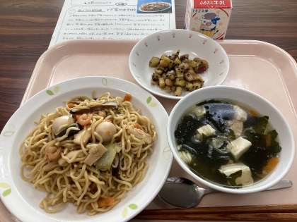☆献立☆ 上海焼きそば 牛乳 わかめスープ お豆のかりんとう