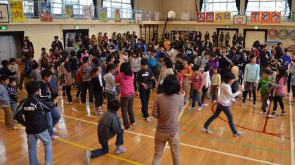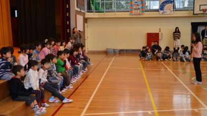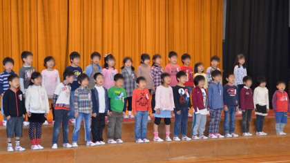 セレモニーの後は各学年が入り交じって「猛獣狩りをしようよ」のゲーム3回戦で大盛り上がり。高学年の児童がみんなに声をかけ誘って人数分のグループをつくって楽しみました。最後は1年生が歓迎に応えるお礼の言葉と抱負を語って、「さんぽ」を元気よく歌いました。会場からは歓迎と励ましの大きな拍手が。これで1年生は「希望っ子」の仲間入りです。