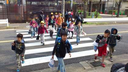 16日(月)の正門前登校のようすです。今年度開校の船橋希望中学校の生徒が、ずいぶん正門前の信号を渡るようになりました。これは、船橋中学校に通っていた生徒が希望ヶ丘通りを渡って行くようになったからです。横断歩道上で本校児童とすれちがいます。まだちょっとぎこちない雰囲気です。お互い気持ちよくあいさつできるようになるとよいですね。