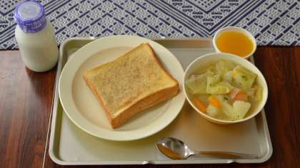 1年生、小学校初めての給食のメニューは、セサミトースト、ポトフ、みかんゼリー、牛乳です。みんなでおいしくいただきました。