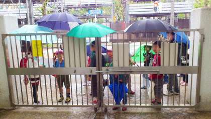 26日(木)、開門前の正門にカサの花が・・・。毎日8時5分に正門を開けるのですが、それより早く登校してきた子が待っています。今日は雨が降っていたので、正門の扉にカサをひっかけて手で持たなくてもよいようにして待っていました。「よいアイディアだね」と言うと、恥ずかしそうに笑顔で応えてくれました。
