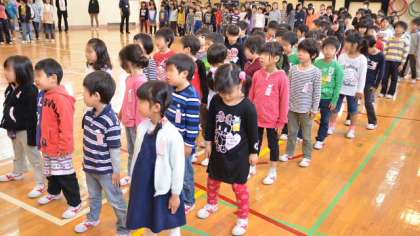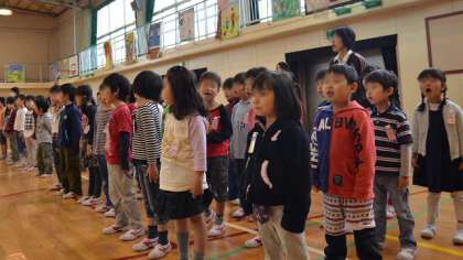 27日の1年生。音楽朝会のようすです。整列もきちんとできるようになり、しっかり歌えました。りっぱな1年生です。