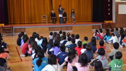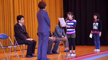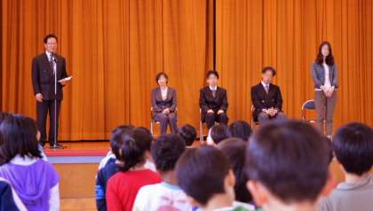 27日(金)5校時、離任式を行いました。4月から異動して他の学校で仕事をしている教員、主事さんをお呼びしての、子どもたちとのお別れの会です。校長から離任された方々の紹介をした後、子どもたちの代表がお礼の言葉を述べました。思い出やエピソードを交えて心のこもった言葉を贈りました。
