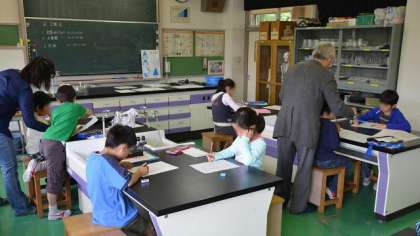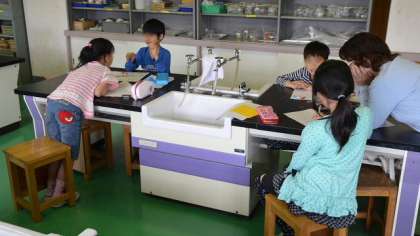 28日(土)、ゴールデンウィーク、大型連休の初日で天気にも恵まれ心地よい日となりました。この日午前中、新寺子屋今年度2回目が開かれました。今年度は参加が総勢41名と大所帯のため、2階の理科室とランチルームに分かれて実施することになりました。写真は理科室で学習する2・3年生のようすです。お休みの日に出てきて一生懸命勉強する子どもたち、えらいですね。