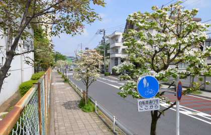 校庭東側の並木道です。ハナミズキの白い花が盛りで、ひときわ華やかな印象ですね。