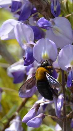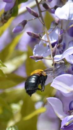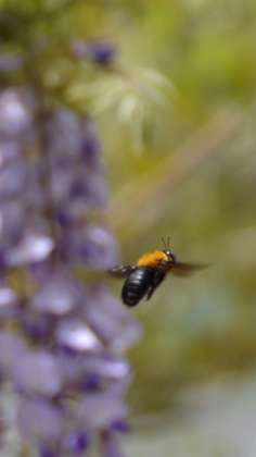 職員室前のフジの花に集まってくるクマバチ。注意の看板を出していますが、むやみに手で払ったり騒いだりしなければ大丈夫です。よく観察するとおもしろいですよ。