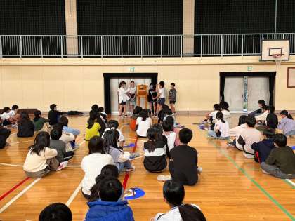 自己紹介をした後、早速扇の使い方を教わっていました。本格的には2月から行いますが、5年生からは「扇の使い方が難しかった」「師匠が優しかった」等たくさんの感想が出ました。