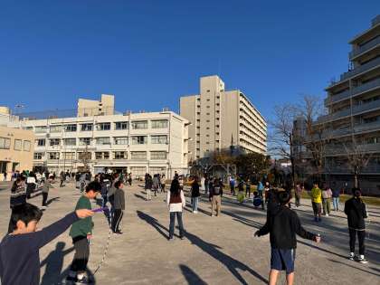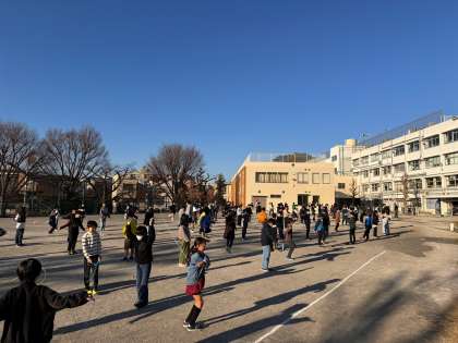 今日は新年最初のスポーツタイムでした。青空の下、今月は短縄跳びに取り組みます。まずは時間を計って前跳びや後ろ跳び、あや跳びがどれだけできるか挑戦しました。