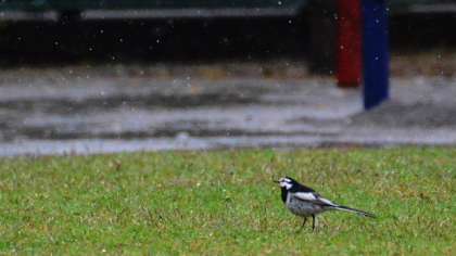 今日は雨の予報でしたので、昨日昼過ぎに遠足の延期を決定しました。ところが11時頃までは雨が降らず、「あれっ」という感じでしたが、11時半頃から雨が降り始めました。時がたつにつれて次第に雨脚がつ強くなってきました。雨のようすを写真にとってみました。上は水たまりに落ちる雨粒。中は葉っぱについた雨の雫。下は、雨なのに芝生にやってきたハクセキレイです。雨というといやなイメージですが、よく観察すると様々な自然の情景があるのですね。(ISO感度を上げて、シャッタースピードを上げて撮影してみました。ハクセキレイのまわりに雨粒が写っているのがわかりますか。