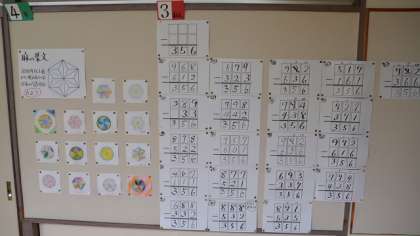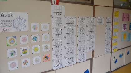 希望丘小学校の紹介。廊下の掲示の工夫を紹介します。これは学習室の掲示。算数の少人数学習に使用する教室の廊下にはってある、子どもたちの学習カードなどです。算数の問題を解くときのアイディアなどがわかりやすく書いてあります。