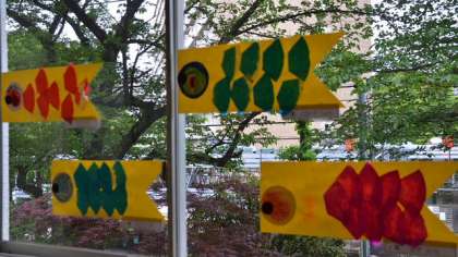 5月5日は「こどもの日」。2階のろうかの窓に、1年生が手作りした鯉のぼりが飾ってあります。これは学校の北側の希望ヶ丘通りからも見えます。この作品は、1年生が入学してから初めて図工室で作ったものです。鯉のぼりの型紙は全員共通ですが、ウロコに着色して貼り付けました。元気な1年生の雰囲気が良く出ています。