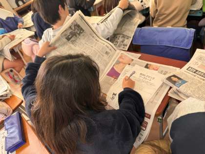 紙面から気になる記事を8つ選び、3つ揃ったらビンゴになります。代表の子が何人か発表しましたが、さすがは5年生。なぜその記事を選んだのか理由を問われると「美術面だったので、デザインが面白いから」「地震関連の記事だったので、応援したいから」と発表しました。教科書だけでは分からない、学びの多い時間だったと思います。