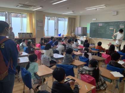 4月に入学する近隣の保育園の子どもたちが、1年生の教室を見学しました。国語や算数、図工の学習の様子を静かに見ていました。小学校ではいろいろな学習をすることが分かったようです。1年生もはりきって学習に取り組んでいました。