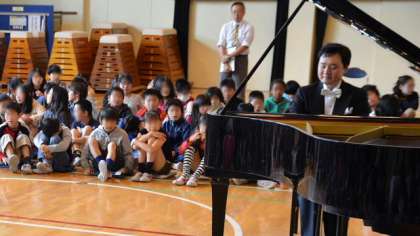 プログラム最後の演奏はショパンの英雄ポロネーズ。力強くかつ繊細な演奏に子どもたちは聞き入り、終了と同時に大きな拍手とアンコールの声がかかりました。アンコール演奏終了後6年児童代表がお礼のことばを述べ、花束をおくりました。