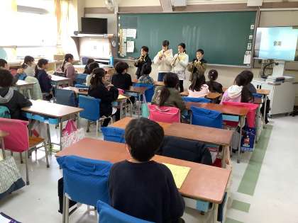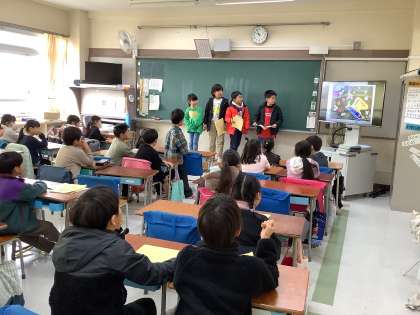 書写、体育(運動会)、図工、社会、音楽(ミニコンサート)、総合、理科の7つのことを紹介しました。写真を見せたり、実験をしたり、クイズを出したりして2年生が分かりやすいように各グループで工夫しました。
