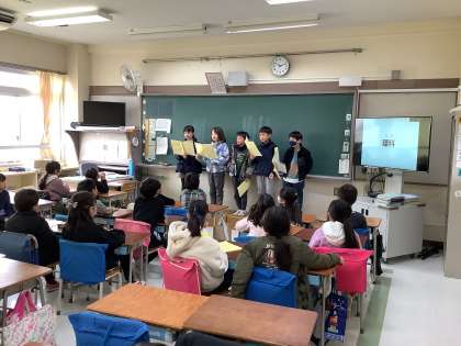 国語の学習で、3年生になって新しく始まることを2年生に紹介する学習をしています。今日(2/29)は、2年生に発表しました。