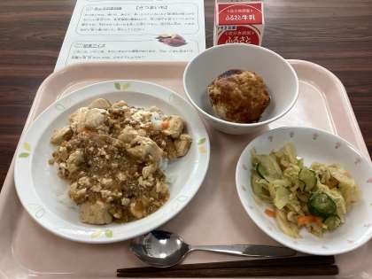献立 麻婆豆腐丼 牛乳 野菜の中華かけ さつまいものごま団子