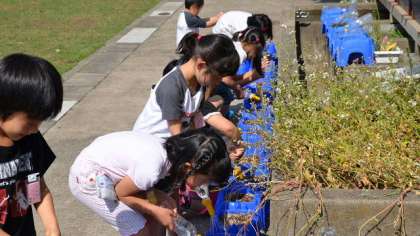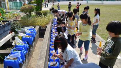14日朝会終了後、1年生が教室に入る前に一人一はちの自分のアサガオに水やりをしていました。一人一人が「しっかり芽を出すんだよ」という願いをこめているように見えました。