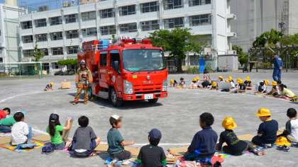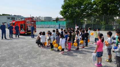 14日、延期していた1・2年生の「はたらく消防写生会」を実施しました。成城消防署千歳分室からやってきた消防ポンプ車。校庭に乗り入れた消防車を見て1年生は大感激。天気がよすぎて日差しが強く、ちょっと暑いくらいでしたが、目の前の消防車を夢中になって描いていました。
