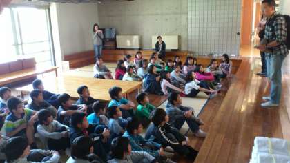 避難訓練を行い、大広間に集合してビレジの使い方などについて説明を聞きました。