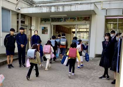 4月10日から3日間、船橋希望学舎合同あいさつキャンペーンが行われています。船橋希望中学校の2年生と3年生が正門のところに立ち、挨拶をして小学生を迎えています。