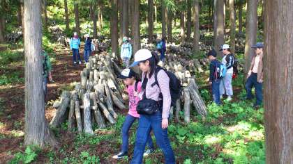ハイキングの最後に、シイタケ栽培の見学。ハイキング無事終了。