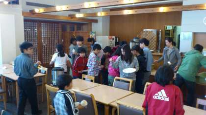 朝食終了。みんなで片付け。