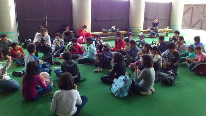 ビレジに戻って、おやつのアップルパイを食べました。屋根付き広場の人工芝の上で、のんびりゆったりです。