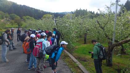 村めぐり開始です。リンゴの木の説明を聞いているところです。