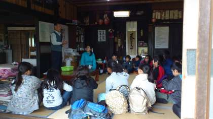 農家の宮田さんの古民家にあげていただいて、村のこと、農業のこと、自然の大切さについてお話しをしていただきました。みんな熱心に聞いていました。