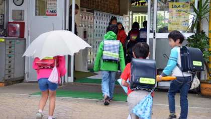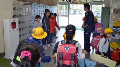 今週のあいさつ当番は4年生です。22日今朝は小雨が降っていたので玄関ホールであいさつをしました。次々とやってくる子どもたちに、専科の教員と一緒にしっかりあいさつしました。