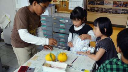 本校では、牛乳パックとペットボトルキャップのリサイクルに取り組んでいます。子どもたちが家からもってきたものを、エコ委員会の児童が受け付け、カードにスタンプを押して貯金のようにしていきます。今日は1年生がやってきて、たくさんスタンプをためていました。スタンプがカード一枚分になると、学校でとれたミカンなどが景品として渡されます。