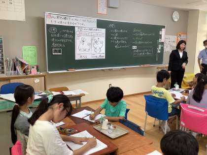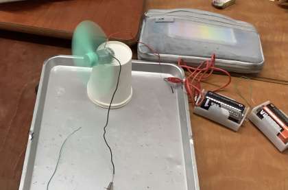 「乾電池の数を1つから2つにするとプロペラの回る速さはどう変わるか」実験を通して考えました。乾電池のつなぎ方によって、プロペラの回る速さが変わることに気付き、興味をもって取り組んでいました。
