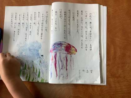 一人ぼっちのスイミーが「すばらしいもの」や「おもしろいもの」を見て元気を取り戻したときの気持ちを考えました。スイミーになった気分で海の中で見たものをイメージしながら読み進めました。