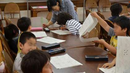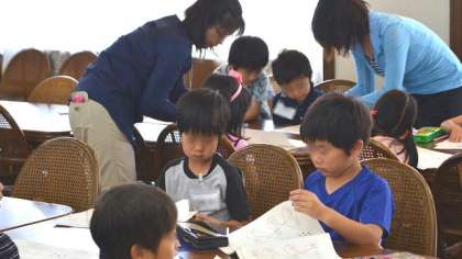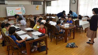 26日(土)の新寺子屋です。1階のランチルームでは1年生が勉強。今日は講師の先生はじめ保護者のスタッフも含めて4人で指導。たくさん○をもらってうれしそうです。やる気が出ますね。